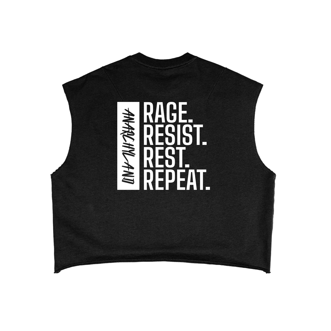 Flip it around and the back says what comes next: Rage. Resist. Rest. Repeat. The Anarchyland wordmark runs vertical alongside it.