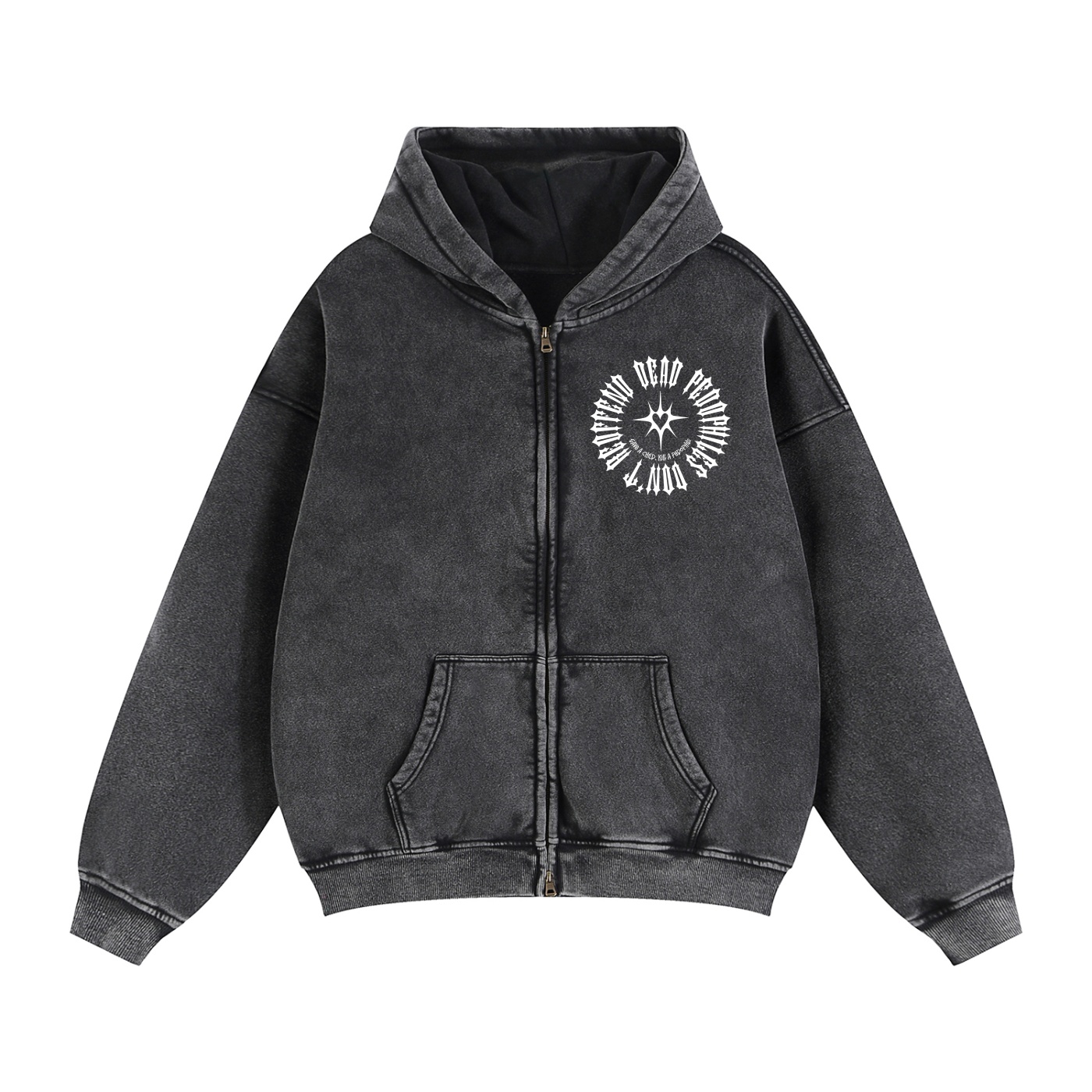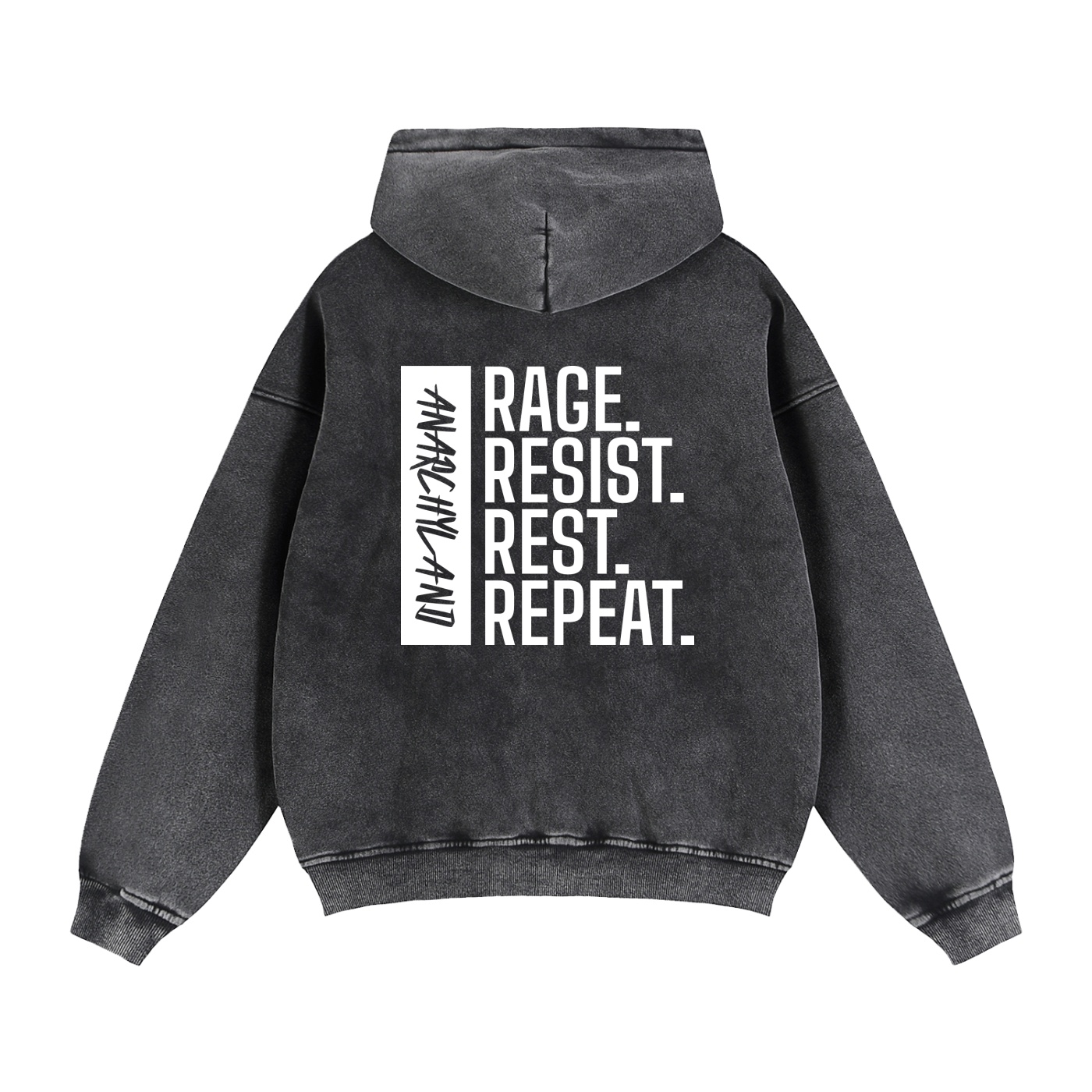 10.5oz vintage-washed zip-through fleece — the heaviest, warmest piece in the Anarchyland lineup. Drop shoulder, boxy fit, front kangaroo pocket, full zip. Built for the long haul because this fight is one. Rage. Resist. Rest. Repeat. on the back, because protecting kids is part of the same work as everything else this store stands for.