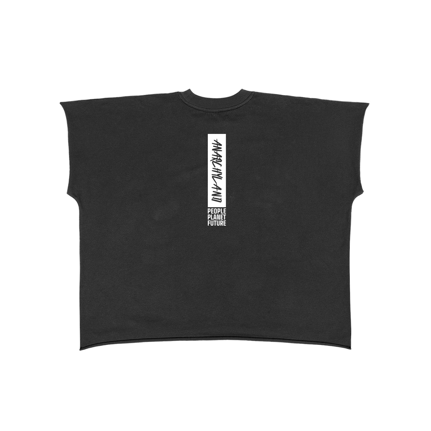 8.3oz heavyweight cotton with a raw edge hem and boxy drop-shoulder cut. Built to last, built to feel substantial, built to be the shirt you put on when you mean it. The Anarchyland wordmark and mission — people, planet, future — sit on the back, because this is what that looks like in practice.