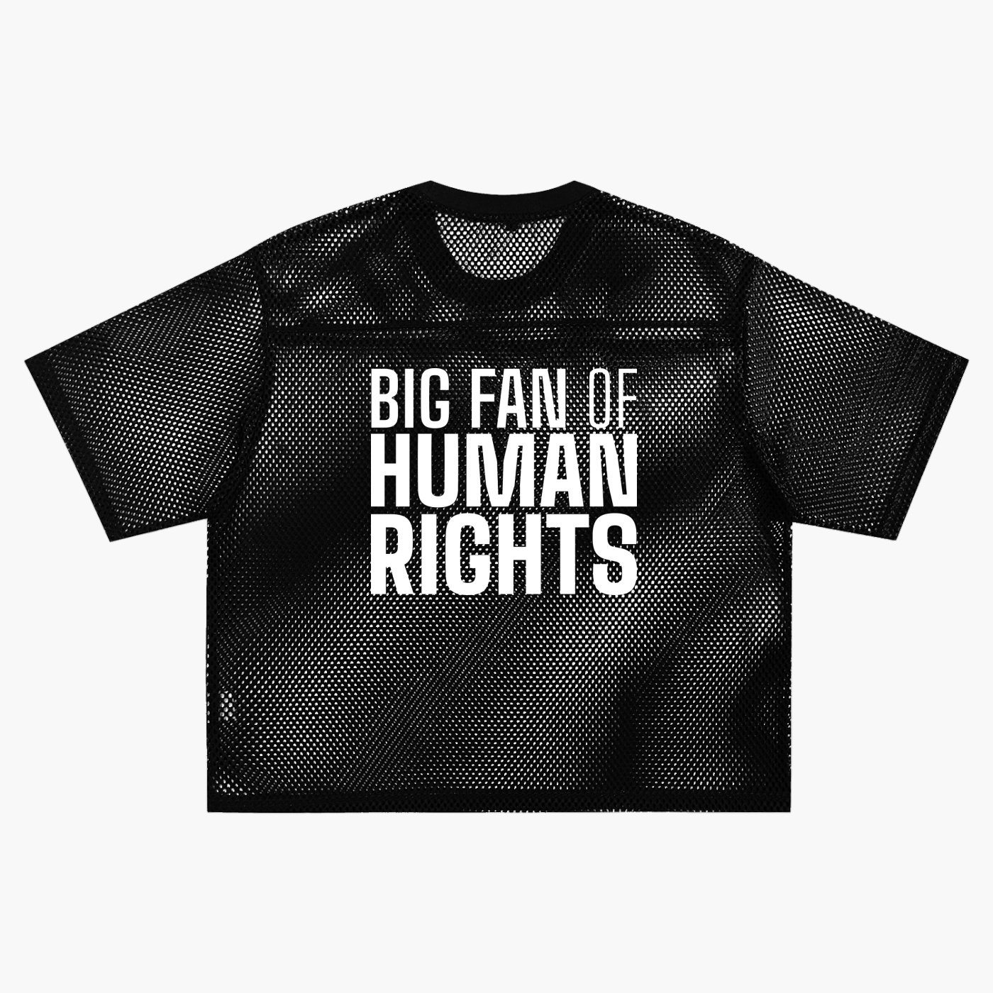 Black mesh T-shirt with bold white text: 'BIG FAN OF HUMAN RIGHTS' across the chest, graphic-forward design.