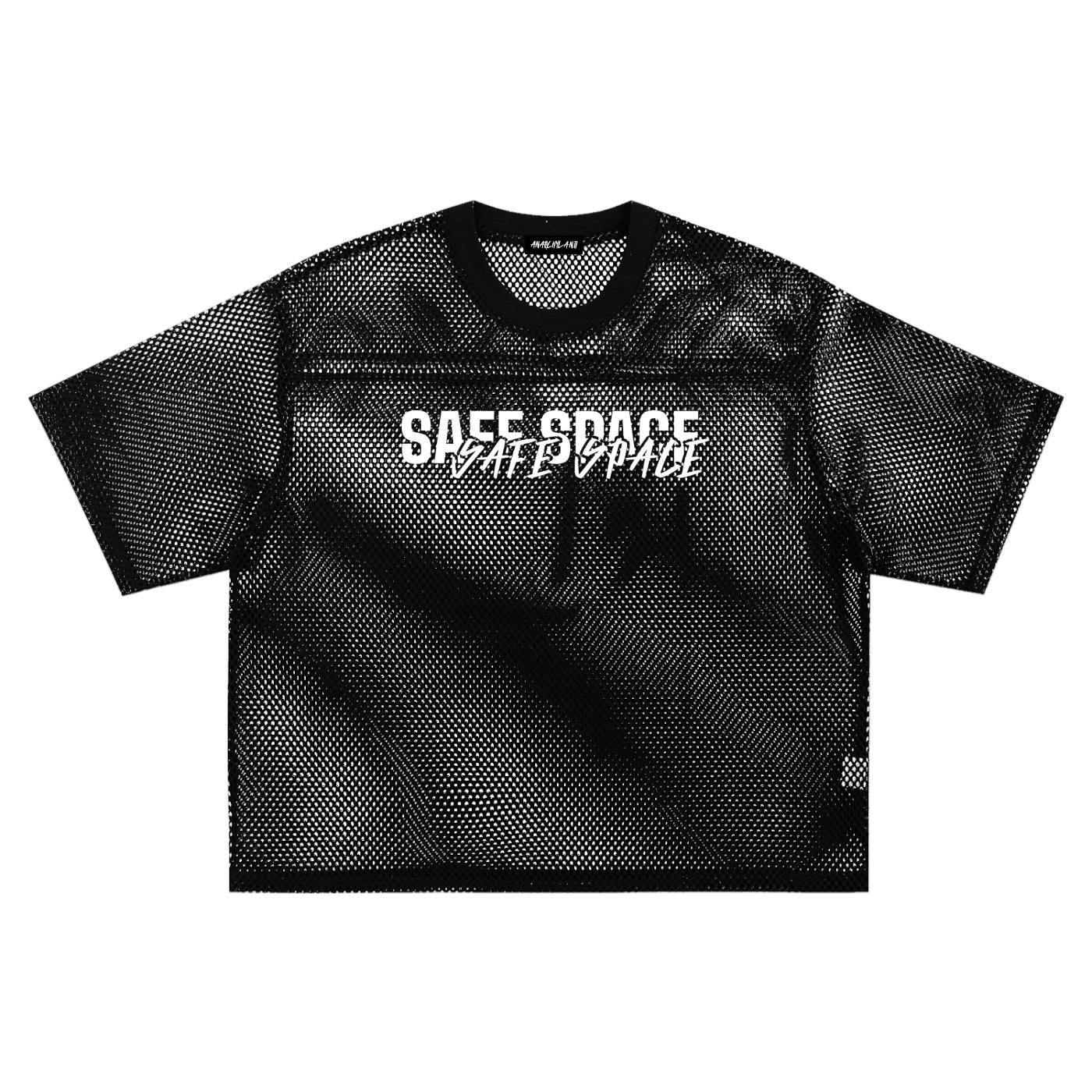 Black mesh cropped T-shirt with a white 'SAFE SPACE' graphic across the chest, shown against a white background.