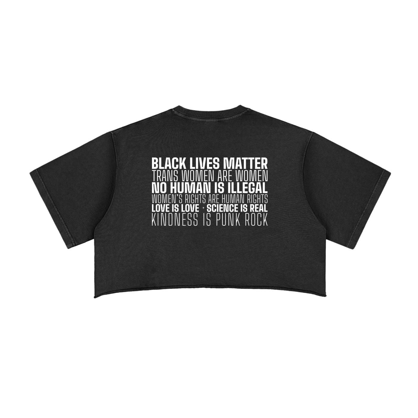 The front makes the point: Silence Is Compliance. The back backs it up — Black Lives Matter. Trans Women Are Women. No Human Is Illegal. Women’s Rights Are Human Rights. Love Is Love. Science Is Real. Kindness Is Punk Rock.