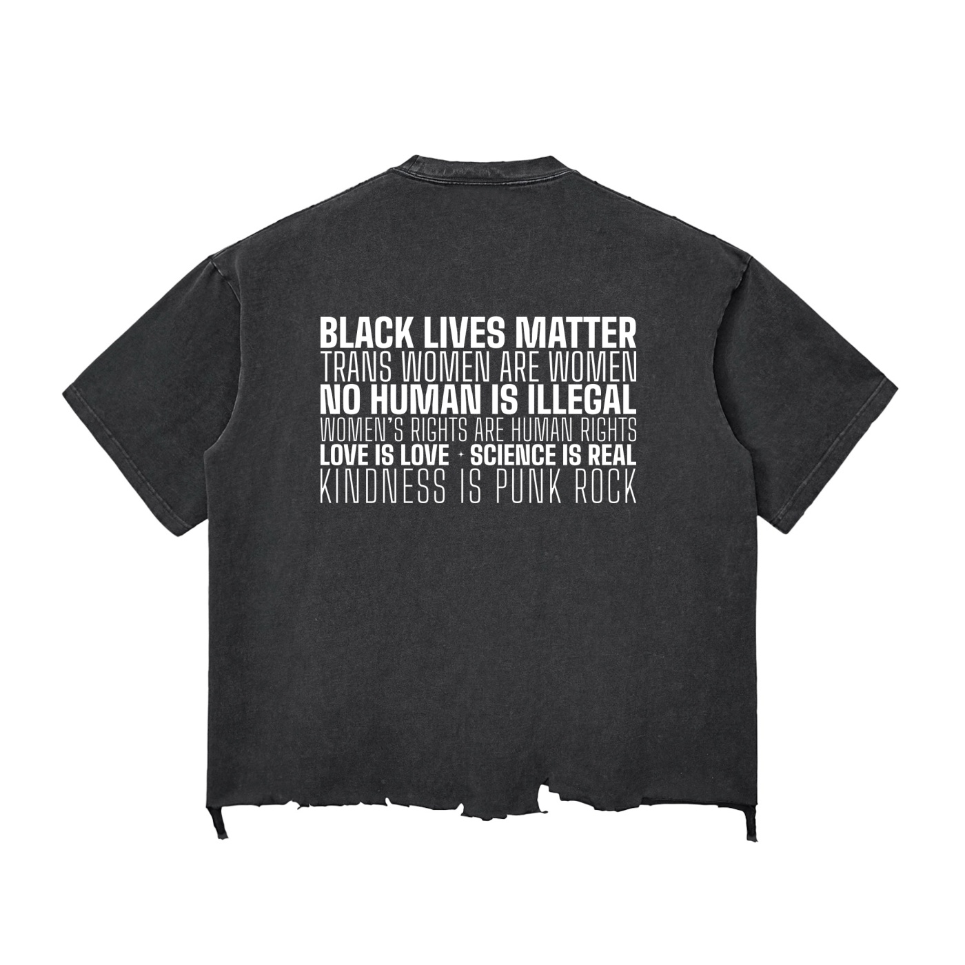 Activist Facts on the front. The full manifesto on the back. 10oz 100% cotton, snow washed, raw hem, oversized boxy fit. The heaviest tee in the collection and the most complete statement. From Anarchyland.