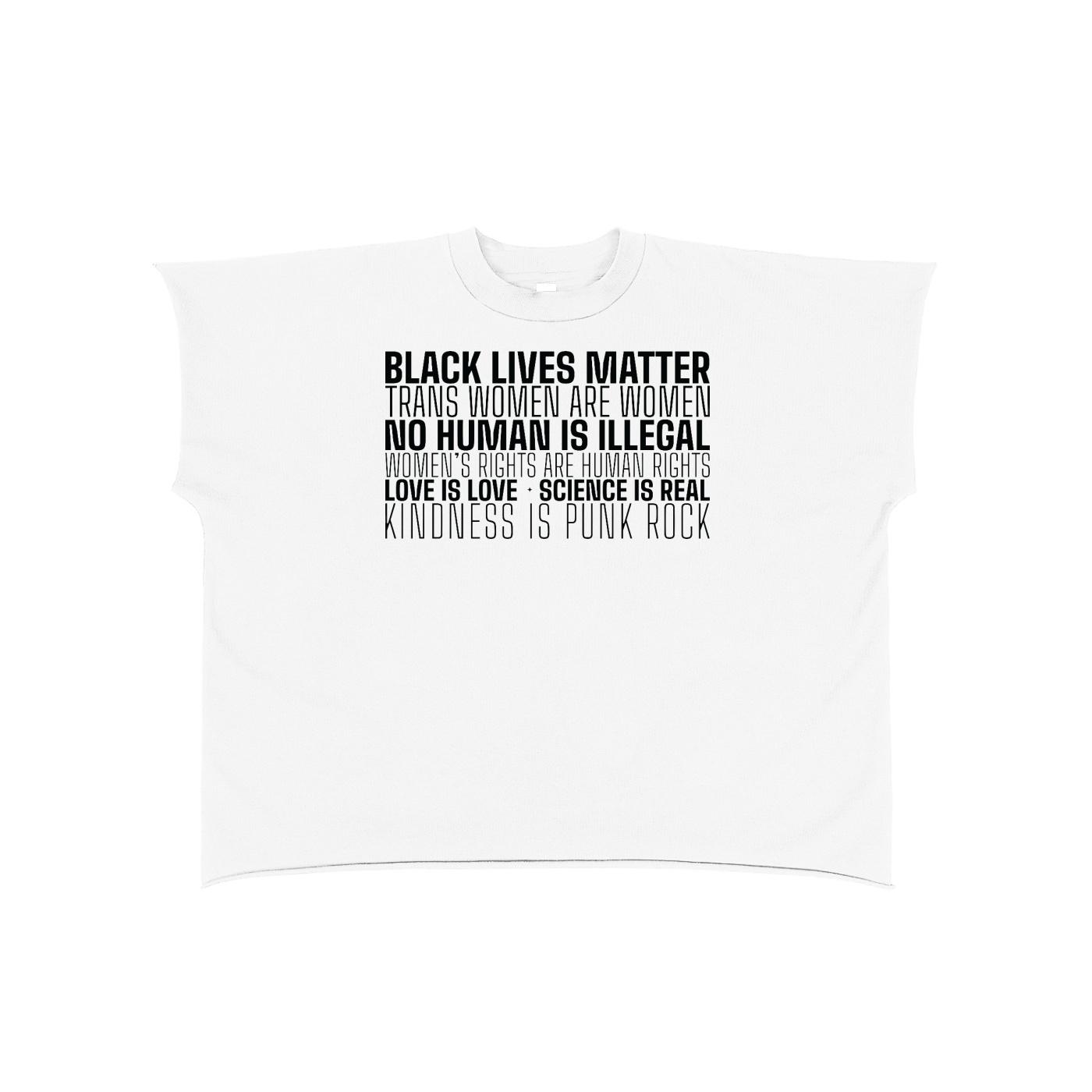 Raw edge boxy construction — 8.3oz heavyweight non-shrink cotton, frayed hem, drop shoulder, built to last — but on white the manifesto reads completely differently. Starker. More document. More undeniable. Black Lives Matter. Trans Women Are Women. No Human Is Illegal. Women’s Rights Are Human Rights. Love Is Love. Science Is Real. Kindness Is Punk Rock.