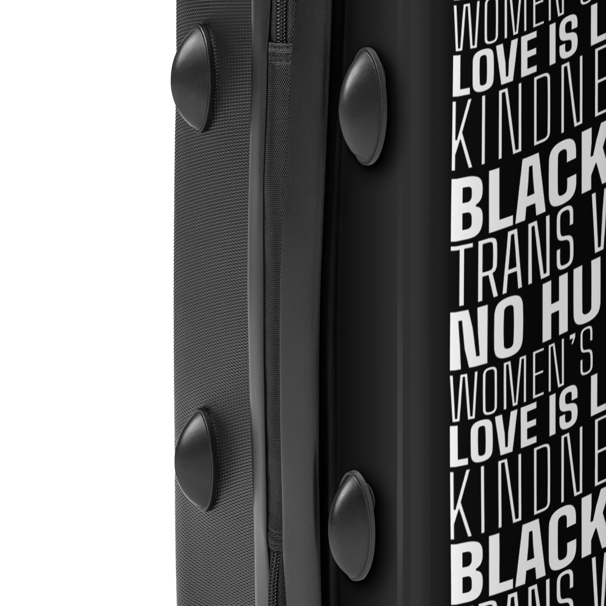 The full We Hold These Truths declaration repeats across the entire hard shell — Black Lives Matter, Trans Women Are Women, No Human Is Illegal, Women’s Rights Are Human Rights, Love Is Love, Science Is Real, Kindness Is Punk Rock — edge to edge, top to bottom, on every surface. It doesn’t whisper. It doesn’t hedge. It travels with full conviction through every terminal, every security line, every city in the world.