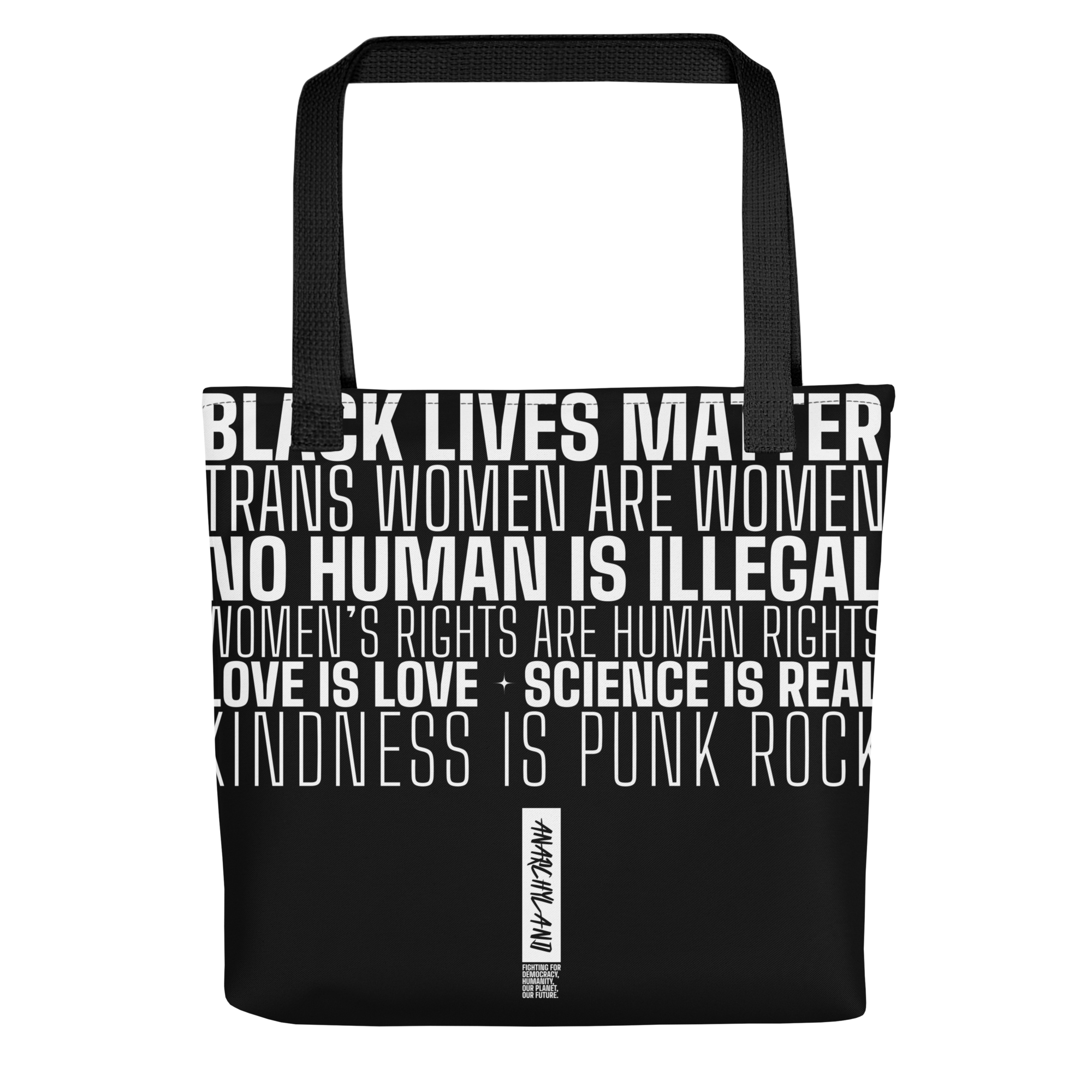 The full We Hold These Truths declaration covers every surface — Black Lives Matter, Trans Women Are Women, No Human Is Illegal, Women’s Rights Are Human Rights, Love Is Love, Science Is Real, Kindness Is Punk Rock — alongside the Anarchyland wordmark and mission: Fighting for democracy, humanity, our planet, our future.
