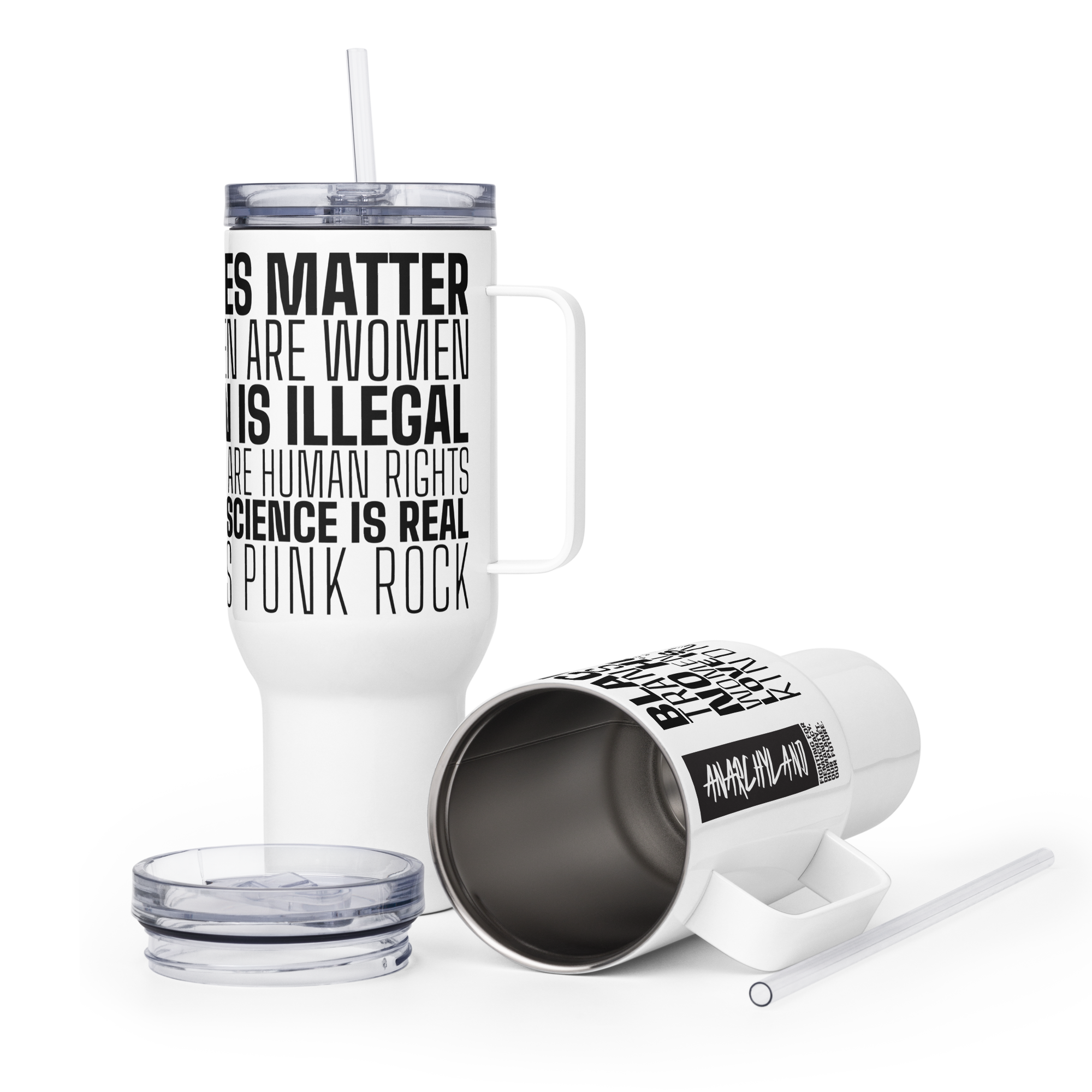 This travel mug carries the full We Hold These Truths declaration on one side — Black Lives Matter, Trans Women Are Women, No Human Is Illegal, Women’s Rights Are Human Rights, Love Is Love, Science Is Real, Kindness Is Punk Rock — and the Anarchyland wordmark and mission on the other: Fighting for democracy, humanity, our planet, our future.